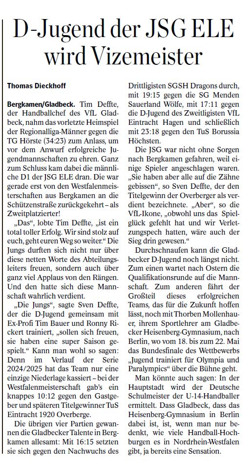 Es spielten: Johan Nattkämper, Jakob Seewöster (je 5), Noah Lange (4/1), Rune Pierenkämper (3), Konstantin Baxmann (3/1), Theo Große-Kreul, Haroun Guizani, Maximilian Wloka (je 2), Mohamed Kadi, Tom Maus, Luca Russo (je 1) und im Tor Simon Zankl.